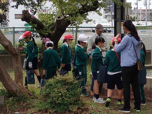 50周年記念授業1回目は,3年生の「ここがすみか」という取組みでした。授業は,4クラスを2回に分けて行われました。各クラス2班に分かれ,班ごとに「どんぐり山」や樹木のことなどを説明。その後,子供たちが校庭の樹木の周りや植え込みの中などに散らばって生き物のいそうな場所を探すのを,子供たちの質問に答えながら手伝いました。子供たちは,何かの棲み処らしいところを見つけるとタブレット端末で写真を撮影していました。後日,どんな生き物がいそうか調べてそこに棲み処を作ってあげるのだそうです。