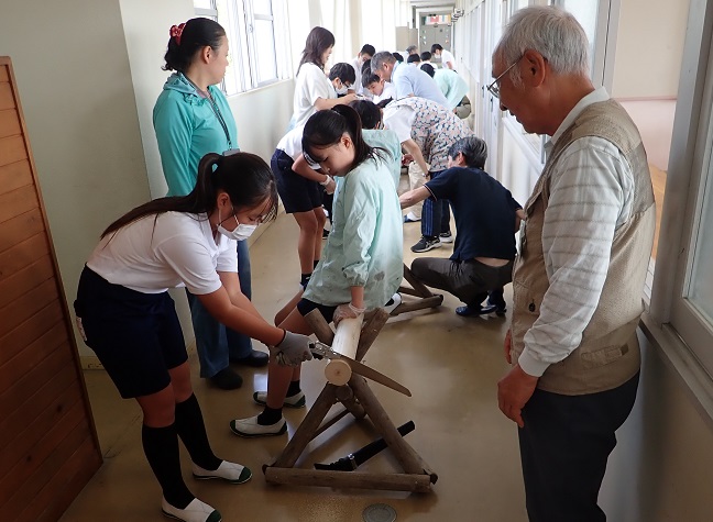 なお,ヒノキの木材は,「どんぐり山」で調達したかったのですが,ちょうどよい太さの木がなかったので,水戸市森林公園にお願いして間伐予定地のヒノキを伐らせていただきました。また,丸太切りの馬と鋸は茨城県森林・林業協会からお借りしました。ありがとうございました。