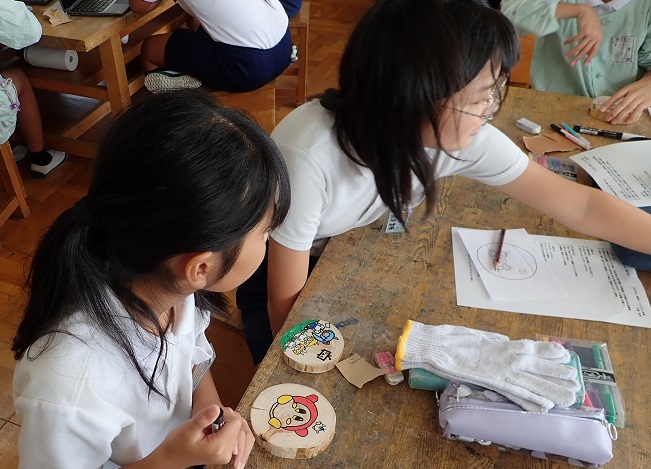 6年生(3クラス)は,ヒノキの間伐材を使ったコースター作りを行いました。授業は,クラスごとに時間をずらして同じ工作室で行われました。各クラス同様の内容で,最初に森林インストラクター茨城の方がヒノキやスギの特徴などを話してから,いばらき森林クラブの会員が「どんぐり山」の話をし,鋸の使い方の説明。その後,子供たちがヒノキの丸太を鋸で輪切りにし,1人1枚ずつコースターを作りました。鋸の取扱いの上手な子も苦手な子もいましたが,全員が奇麗に輪切りすることができました。輪切りにされたコースターは紙やすりで磨かれて,最後に,お気に入りのイラストなどを描いていました。