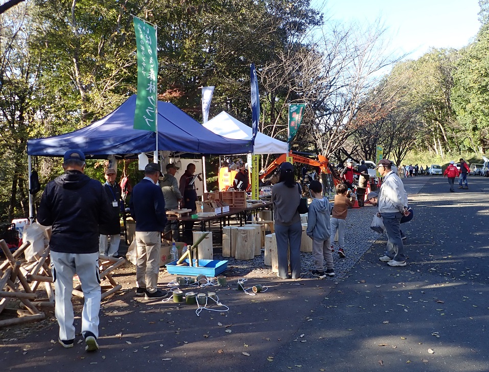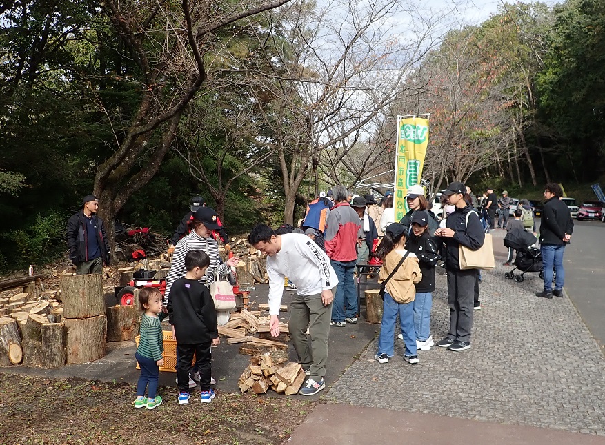 11月3日(月)に行われた水戸市森林公園青空市において,薪作り体験の支援,木工品の展示販売を行いました。薪作り体験では,10月25日(土)に雨が降る中,ナラ枯れ被害木の伐採と玉切りを行って準備。この玉切り材が薪作りに使われました。なお,参加者の持ち帰り用薪は,昨年の薪作り体験で作っておいたもの。木工品は,竹ぽっくりや丸太椅子などが人気でした。