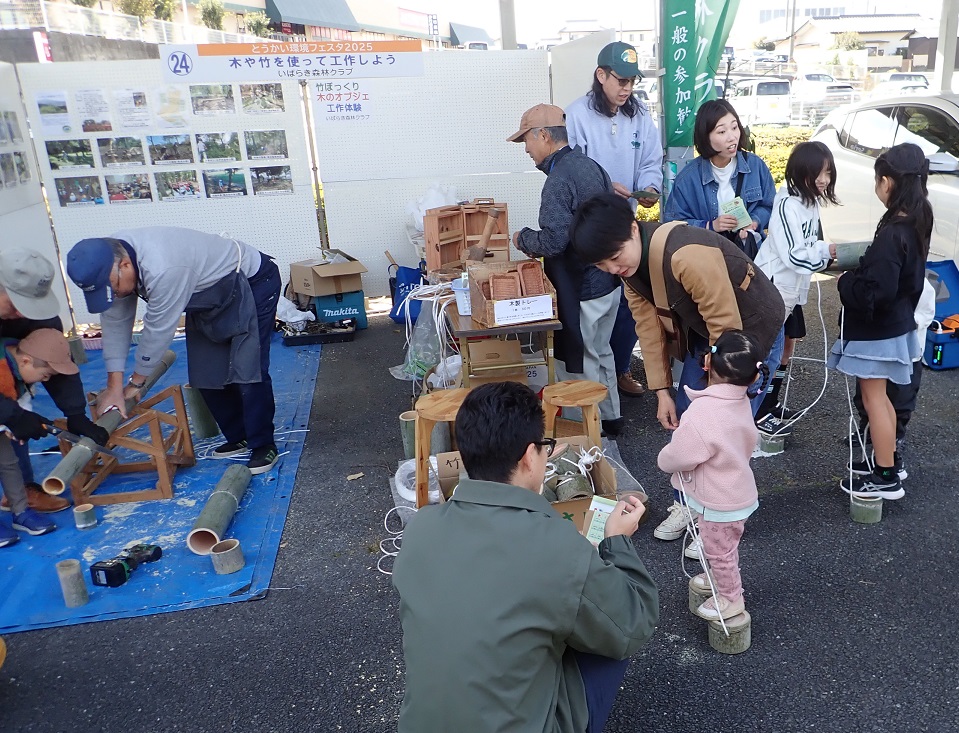 11月8日(土)に東海村役場駐車場で行われた「環境フェスタ」に初めて参加し,活動状況の写真展示,竹ぽっくり作り体験,木の実などを使った工作体験,木工品の展示販売などを行いました。