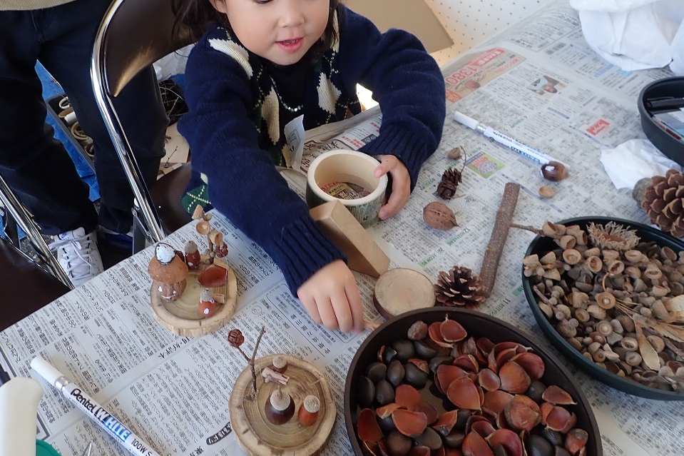 なお,今回使われた素材は,いばらき森林クラブと森林インストラクター茨城の会員が「どんぐり山」や他のフィールドで集めて下処理や切断などをして持ち寄りました。