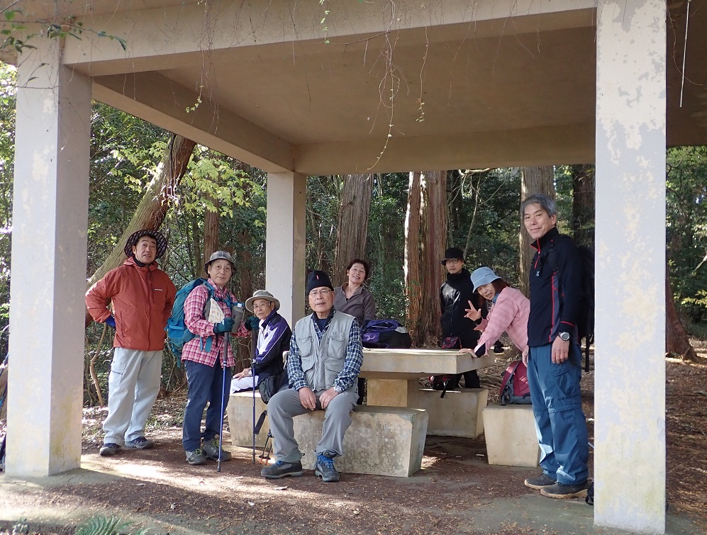 今年の秋のハイキングの行き先は御前山。集合は道の駅「かつら」の川沿いの駐車場。天気は上々だが,川に沿って吹いてくる風が冷たい。全員が集合したところで自己紹介などをして早速歩き始めました。最初は急な山道。途中の眺望の良いところで一休みして,登りきったところで最初のあずまやに到着。