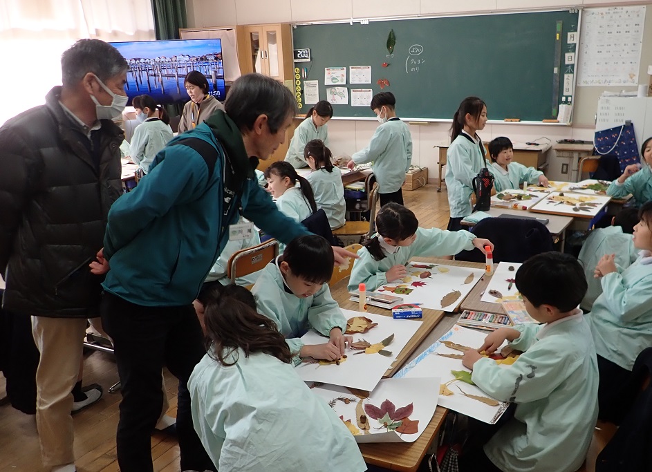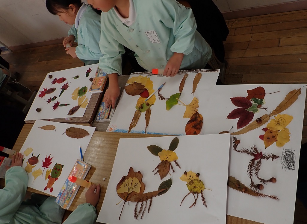 2年生(3クラス)は,木の葉や枝,どんぐりなどを使った図画工作です。事前に校庭や「どんぐり山」で集めておいた木の葉などを使って形の見立てや画用紙に葉や枝を張り付けて絵を作る葉っぱ工作。形や色の面白いものは,私たちも持ち寄りました。最初に葉っぱの見立てがあり,その後,木の葉や紅葉の仕組みなどを説明して,早速作品作りに取り組みました。2年生とは思えない力作もあり,子供たちの発想の豊かさにはいつも驚かされます。