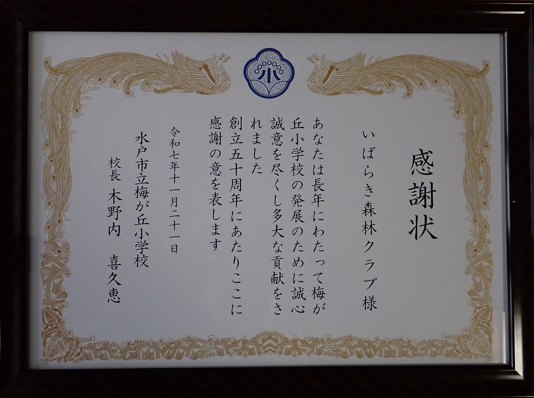 11月21日(金)に水戸市立梅が丘小学校の創立50周年記念式典があり、式典において感謝状をいただきました。梅が丘小学校には、隣接して学校林「どんぐり山」があり、以前から依頼を受けて整備を行ってきました。また、今年度は、「どんぐり山」を活用した50周年記念授業を森林インストラクター茨城と協力して支援しています。いばらき森林クラブは、今後も継続して「どんぐり山」の整備や活用に協力して行く予定です。