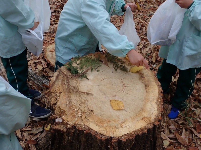 1年生(3クラス)は,樹皮や木の葉のさわり心地を確かめたり,木の葉や枝,どんぐりなどを並べる図画工作です。連続してクラスごとに3回の授業です。各クラスともに,最初に4班に分かれて「どんぐり山」の樹木やどんぐり,木の葉のさわりごこちを確かめました。その後は8班にはかれて,それぞれ,歩きながら集めた木の葉や枝を切り株などの上に並べていました。並べ方は,それぞれ特徴があって面白い。