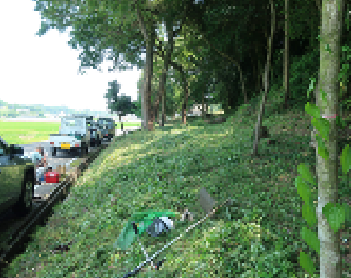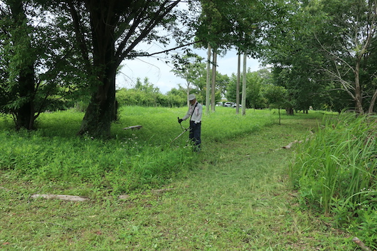 活動初回のこの日は、刈払い機で草刈りをしました。開始まもなく「通り雨」がありましたが、20分ほど待ってから作業を続けました(写真は草刈りの様子です)。作業後半は枯れ枝やプラスチックゴミを片付けました。また、草地に突き出ている古い切り株の一部をチェンソーで切り取りました。