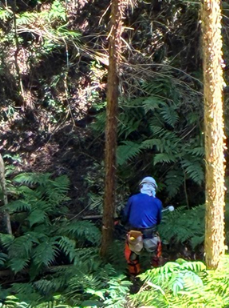 草刈りは駐車場周辺と斜面下の園路沿いでした。夏場の草刈り時に手間取る、「フジ」や「クズ」がもうツルを伸ばし始めています。伐採は斜面中段にある枯損木です。根元の幹が虫食い状態で痛んでおり、斜面下側に大きく傾いた状態でした。写真は伐採後、斜面での玉切り作業です。