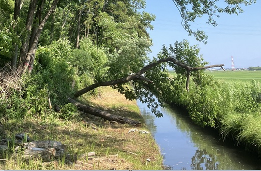 5月は雨で活動が中止となり草木が伸びていたため草刈3人と、強風で枯れ木の倒木もあったため立ち枯れ木の伐倒2人及び北西側の立木の伐倒5人に分かれての作業としました。立ち枯れの木の処理では根元からの伐倒は問題なかったのですが、上部の一部が枯れている立木では高枝鋸では届かない場合もあり放置するのは気が引けましたが、木に登っての作業は限られた熟練の方の作業となるため、道具等を準備し次回以降に行うこととしました。