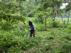 午前の作業は植林したエリアの除草です。先月は小さかった苗木の葉が、鮮やかな緑色の若葉に成長していました。雑草も大いに成長していて、苗を隠してしまうほど生い茂っていました。添木に巻いたピンクテープを頼りに、苗木を切らないように注意しながら刈り払い機で除草しました。
