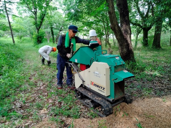このところ、梅雨のはしりのような天候で、本日の活動も雨が心配でしたが、幸い雨は降らず、予定通り活動を実施することができました。本日の活動には、小池地区の自治会の方が約30名参加され、草刈りのお手伝いをしていただきました。皆さん、草刈りには慣れておられるようで、盛大にエンジン音を響かせ、普段手が回らないケヤキの下や公園の奥の草刈りを手際よく実施していただきました。ただただ、感謝です。今回は霞ヶ浦環境センターから小型のチッパーをお借りして、枯れ枝を粉砕して園路に散布しました。これと並行して竹炭の材料の準備を実施しました。